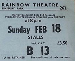 The Sham 69 gig ends in a fiasco. The gig lasted 20 minutes through fighting, stage invasions and skinheads out in force.The fire curtain is dropped and isn't raised until the audience are gone. | ![]() |