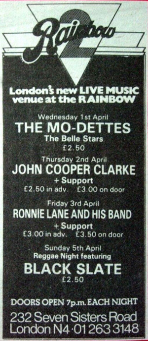| These four concerts were staged in the foyer of the theatre, Billed as Rainbow 2. Those who went descibed them as great little "intimate" concerts, especially the Ronnie Lane show which went on very late | ||||||||||||||